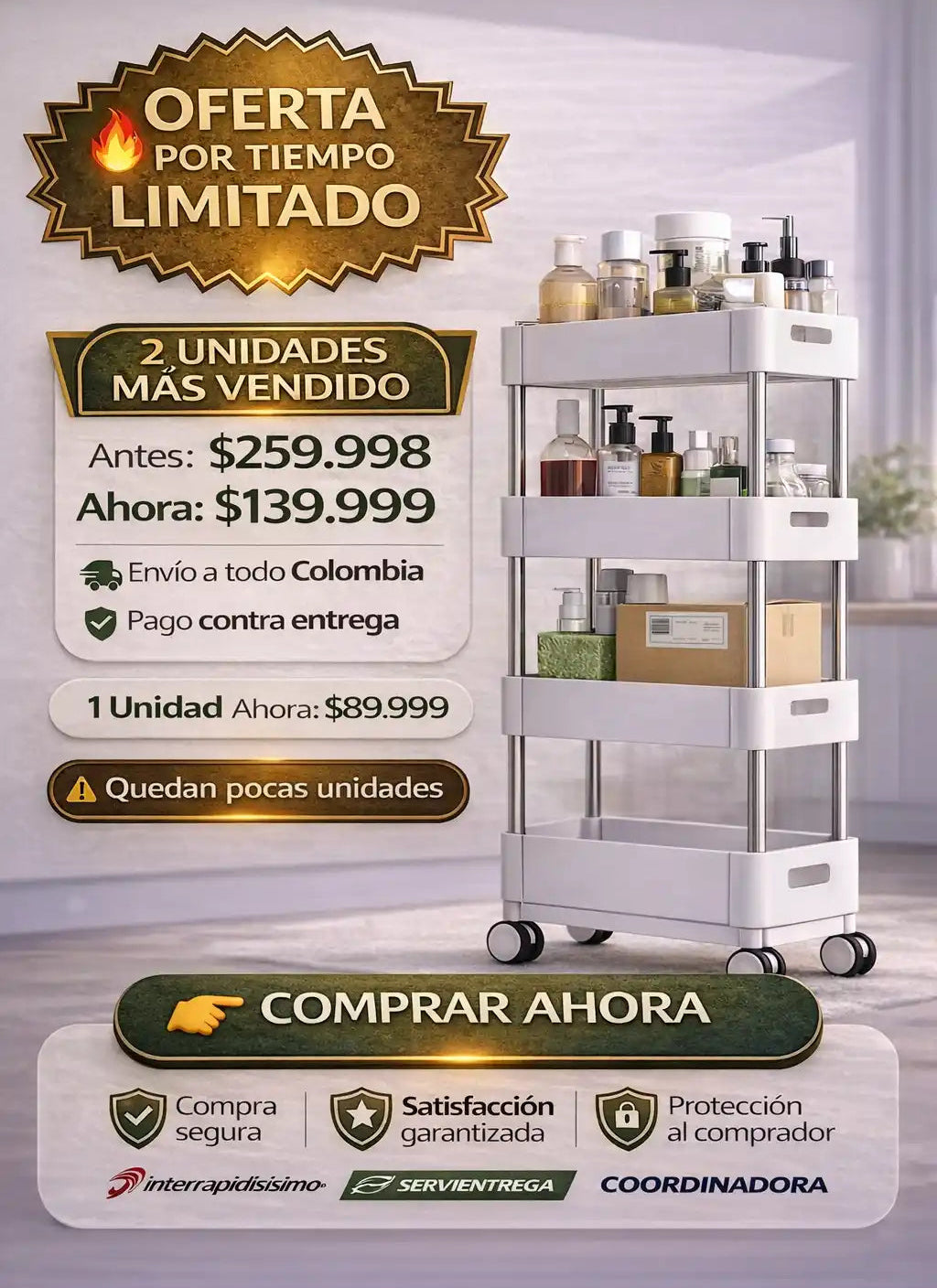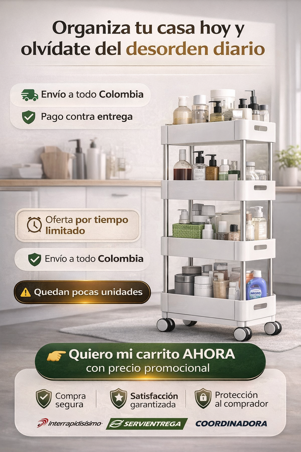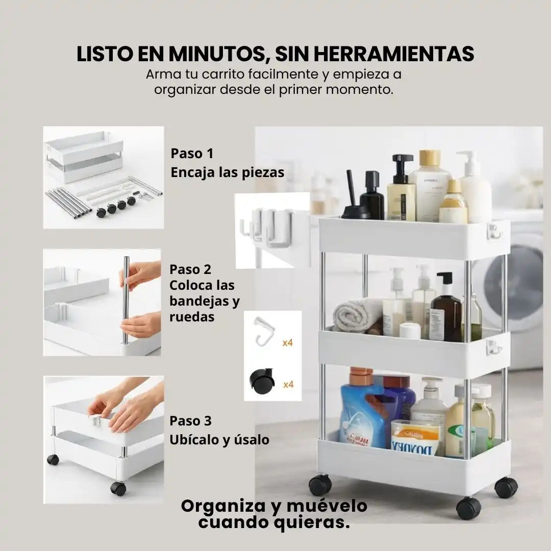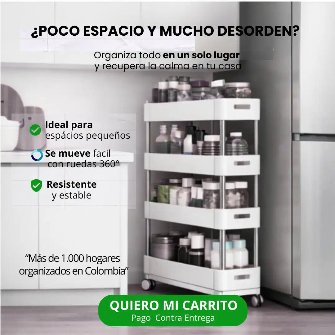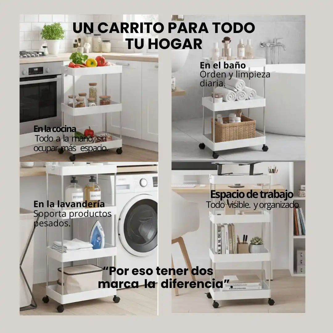 Las ruedas son giratorias 360° y cuentan con freno, lo que permite mover el carrito fácilmente y fijarlo cuando lo necesites. Están pensadas para el uso diario y pisos comunes en hogares colombianos.